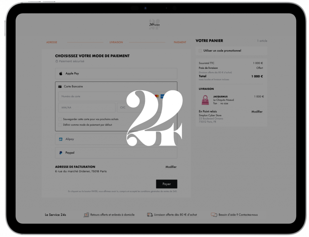 Pendant ma mission chez 24S, j’ai été chargée de repenser l’expérience utilisateur de la page de paiement du site web 24S.com et de l’application mobile iOS. L’objectif était d’améliorer la fluidité du processus de paiement tout en alignant le design avec la nouvelle identité visuelle de la marque.